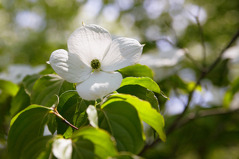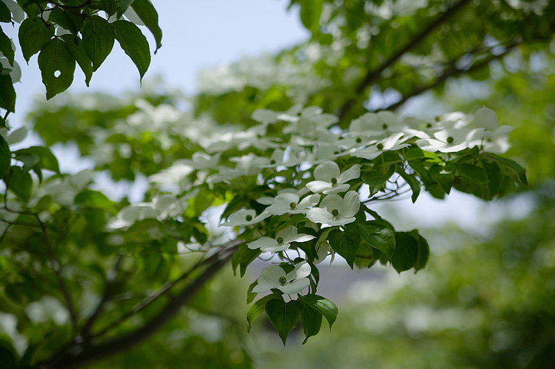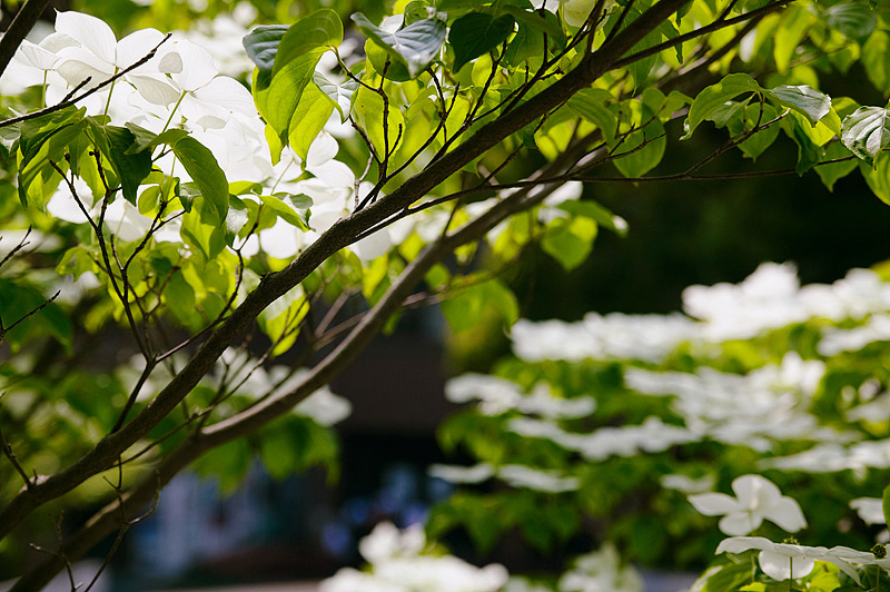 ハナミズキの頃5月24日、今年もハナミズキの頃を迎えた伏見区深草の丘陵。南斜面に初夏の陽光が降り注いだ。伏見桃山城や京セラ社屋の向こうに天王山が見渡せる。梅雨を前に束の間の溢れる光を一身に楽しむかのような緑とともに、無数のハナミズキが咲き誇る。何とも近寄りがたい美しさだ。筆者にとっては今年が見納めとなる。いつまでも咲き続けてほしいと願おう。