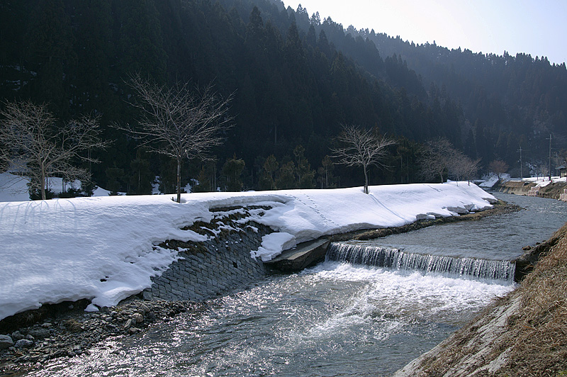 京北散歩-1/32014年3月17日、長らくお世話になった職場の先輩がご紹介くださった京都市右京区の京北(けいほく)を訪ねた。午後1時に伏見を出発、街では気温15度で春の足音が近づいている頃だが、鞍馬から花背を通る険しい道では残雪に驚いた。広河原では伝統行事「松上げ」用の大木が雪原に横たわっていた。洛北の春まだ遠い、と実感しながら道を進んだ。