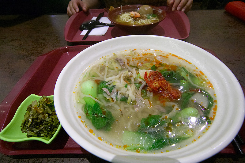 台北101フードコートで腹ごしらえ、「金牌牛肉麺」という店で適当に麺類を注文(70元ほど) フリートッピングの赤い薬味を少し足して食べ始めた。野菜主体で侮っていたら激辛で、自信満々で臨んだ筆者は簡単に鼻を折られてしまった。生まれて初めての敗北を喫した。涙と鼻水と汗と...体内から全ての水分が同時に放出されるという貴重な体験だった。それでも何とか完食し、すぐさま「のど飴」を口に放り込んで事なきを得た。フードコート、侮るべからず。