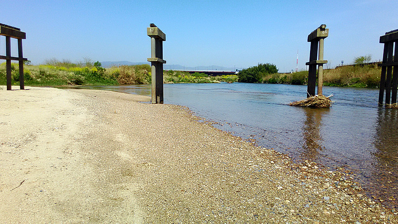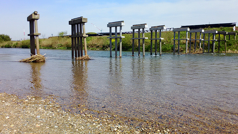 4月18日、久しぶりの快晴だ。分かっていた事実なのだが、陽気に誘われて流されてしまった「流れ橋」に来てみた。橋脚の残骸が規則正しく並んでいる周囲は、咲き乱れる黄色い菜の花で彩られていた。日本の代表的な流れ橋には人影もなく、ひっそりと、しかし光に満ち溢れていました。