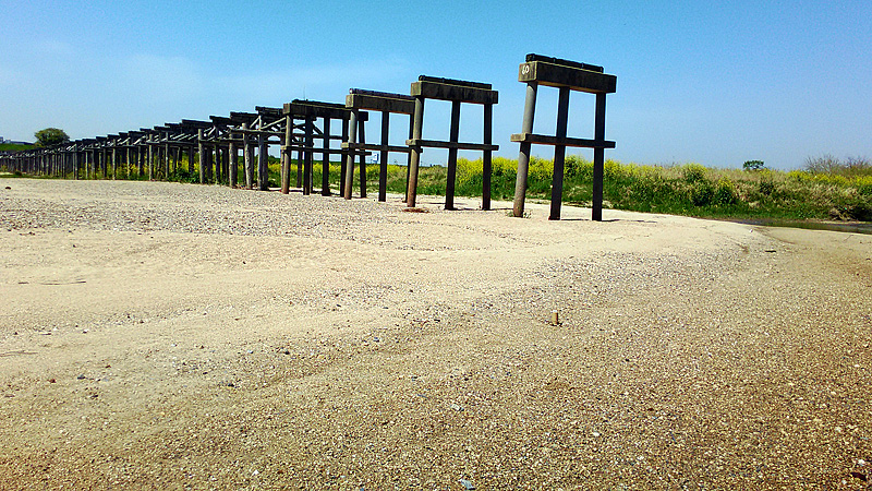 4月18日、久しぶりの快晴だ。分かっていた事実なのだが、陽気に誘われて流されてしまった「流れ橋」に来てみた。橋脚の残骸が規則正しく並んでいる周囲は、咲き乱れる黄色い菜の花で彩られていた。日本の代表的な流れ橋には人影もなく、ひっそりと、しかし光に満ち溢れていました。 長閑かで静かな上津屋橋(流れ橋)前に到着 押しても渡れない 城陽側の本流 遠くに第2京阪道が見える 菜の花に囲まれた橋脚たち 強者どもの夢のあと ↑もどる 次へ→