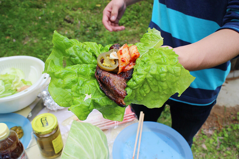 ハラペーニョとキムチを焼肉に添えてチマサンチュで包む