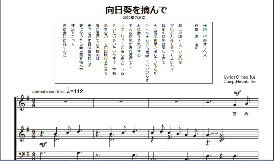 2020年の夏に向けて頑張ろうとしている音楽系部活の中学3年生、高校3年生を応援する曲です。38(19人)の部分は適宜変更して歌ってもらって差し支えありません。印刷用楽譜が必要であれば無料でお使いください。伴奏のみmp.3もあります。もどかしい春をお過ごしの音楽系の皆様へ、少しでも癒しになればと思います。