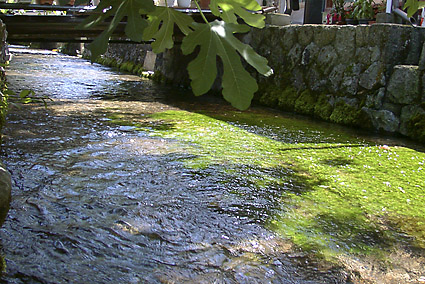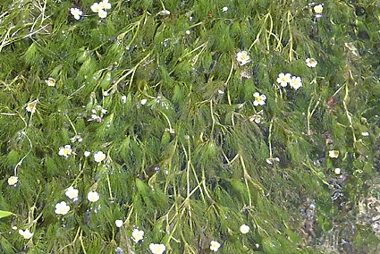 また中山道を流れる地蔵川のバイカモはキンポウゲ科の水生多年草で、水温が18度以下の清流でしか育たない。本来なら普通に見られる水草だ。7〜8月ごろに、梅の花に似た五枚の花弁をもつ白い小花を咲かせることから『梅花藻(バイカモ)』の名が付いた。夏の最盛期には直径1.5cmほどの愛らしい花が一斉に川面から顔を出す。滋賀県米原町の醒ヶ井の地蔵川では、町ぐるみでバイカモとハリヨを保護している。