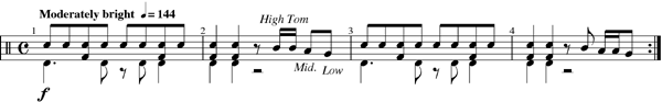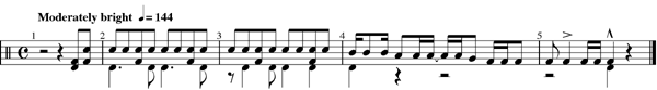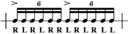 6/8拍子で「RLRRLRLLRLRR|LRLLRLRRLRLL」(Para-triplets)のように使うと楽しいフィルになります。
