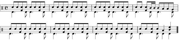 1回の振り下ろしで1回のショットを打つ基本的な奏法です。(RLRLRLRLRLRL...)