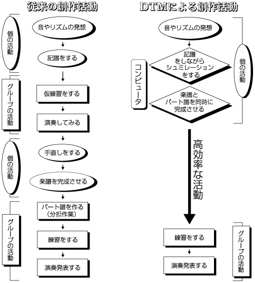 授業における創作活動の流れを比較してみると、従来の作業に比べてDTMによる活動が学習を高効率化させられることが解ります。限られた年間カリキュラムの中で一定の成果を上げ、生徒に達成感を味わわせるためにはコンピュータの導入が必要であることは一目瞭然の結論だと言えます。