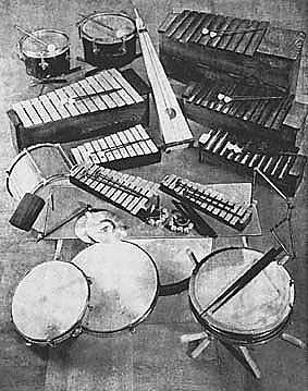 クラベス(拍子木)、ウッド・ブロック、スリット・ドラム、ギロ、木魚、マラカス、木製のガラガラ
