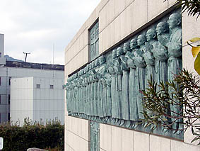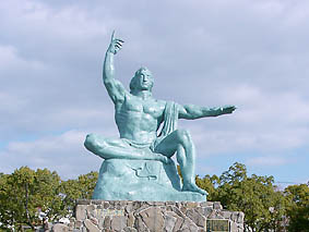 平和祈念像は「平和は長崎から」のスローガンのもと、世界の平和を願って昭和30年に完成した。高さは9.7メートル、重さ30トンの青銅製。天を指した右手は原爆の恐ろしさを示し、水兵に伸ばした左手は平和を呼びかけ、顔は原爆犠牲者の冥福を祈っている。平和祈念像は、劣化による損傷が激しいため、修復工事が行われ、平成12年2月に新しい姿が公開された。