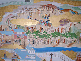 処刑が始まり、若い修道士フィリッポ・デ・ヘススが槍で突かれ、最初の血を流した。アントニオとルドビコの2人の少年は賛えの歌「子らよ、主をたたえよ」を歌い、その歌声が終わるか終わらぬうちに槍で突かれた。こうして次々に処刑は進み、最後にペトロ・バプチスタ司祭が尊い血を流して、処刑は終わったのだ。