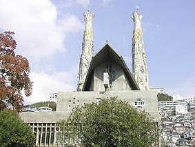 教会の2本の塔は、向かって左が聖母マリアに奉献され、右は精霊に奉献されています。塔に張り付けられた陶片は人々の生活をあらわしている。建物全体は祈りの天使をイメージしたものである。