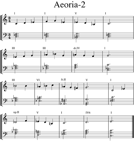 注3)曲の試聴データのエオリア2ではドリアのIV(dr.IV)、フランスのII(fr.II)、ナポリのII(np.II)、IV6の和音(IV6)、終止にピカルディのIを使用しています。