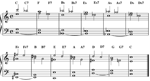 V7−Iのコード進行をDominant Motion(ドミナントモーション)といい、強進行の連続型です。ドミナント・モーションを反復進行させると5度下の調に転調させながら進行していきます。ドミナント7(V7)は不安定なコードなので安定しているトニック(I)で解決します。下の譜例ではC7はFのドミナント7として、 F7はBbのドミナント7と解釈しながら進行します。譜例のように五度圏を巡回するような同型反復進行です。