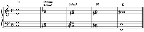 3. C-C#dim7(Gdim7)-F#m7-B7-E