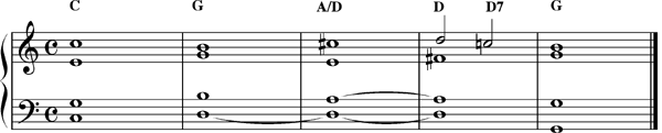 セカンダリードミナントはドッペル・ドミナント(五度上の五度)とも呼ばれ、II7−V7−Iのような進行でドミナントモーションの一端でもあります。上の譜例で最後の3小節がCに対するセカンダリードミナント(DやD7)にあたります。