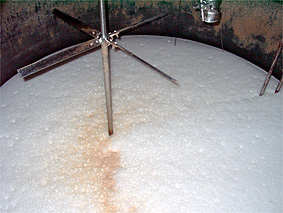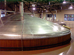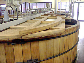 ウイスキー大学-2 まず見学できたのは仕込み槽だ。大麦を発芽させ、麦芽を得る。 温水の中でデンプンが糖分に変わり、麦汁ができていく。 発酵槽の中で麦汁は酵母と出会い、約3日間でアルコール度7%の醪(もろみ)となっていく。 ビールとは違って強烈な発酵のため、泡が溢れないようにファンが回る。 ←前へ 次へ→ プライベートルームへ Topへ