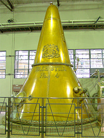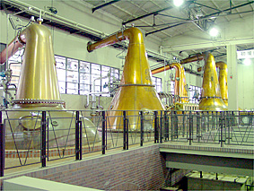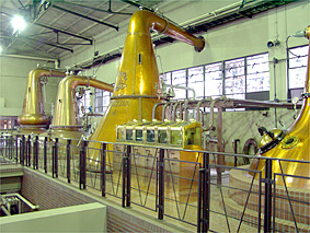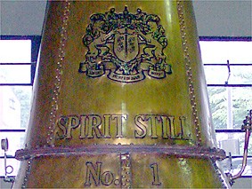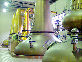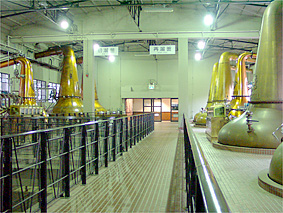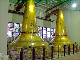 ニューポット(無色透明70度のアルコール)を出荷する習慣になっている。初代の初溜釜から取れたアルコールは外で冷やされ液化する。 この象徴的な姿が整然と並ぶ蒸溜室で、 80年の歳月を経た今日も誇らしげにエンブレムが輝いている。 ←前へ 次へ→ プライベートルームへ Topへ
