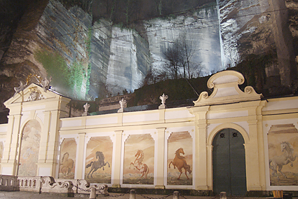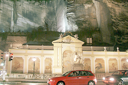 旧市街を目指してSteingasseを南東へ向かう登り道。 下りを快適に散歩すると右手の山腹に教会が見えてきた。 西の山手に教会を見上げる。 岩盤をくり抜いた道を振り返る。 またまたトンネルだ。 サウンドオブミュージックで有名な「馬洗い池」。 背景の岩もライトアップで幽玄な姿で迫ってくる。 続いて現れたのはFestspielhavser祝祭劇場、サウンドオブミュージックで音楽祭が行われたフェルゼンライトシューレはこの中にある。 祝祭劇場の入り口、入れないのが残念。岩盤をくり抜いたホールの響きをいつか味わいたいものだ。 祝祭劇場の向かいにはコレーギエン教会が見える。 旧市街の中心部を通ってゲトライセガッセへ抜ける。 まだ午後6時だというのにゲトライセガッセも人影がまばらだ。 一際明るい場所に近付いていく。 フランツィスカーナ教会。 レジデンツ北側の広場、大聖堂も目前のはずだ。