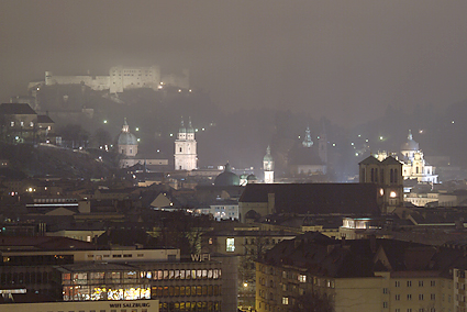 突然現れた雄姿。ザルツブルクでこれまでに通ってきた教会とは大きさが格段に違う。ようやく今晩の目的地、大聖堂に至ったのだ。入り口には明日の朝にはクリスマスのミサが11時から行われると書かれている。楽しみにしていよう。7時を回ったゲトライセガッセは、殆どの店が閉まっている。クリスマスイブは外でなんて考えるのは日本人だけなのか。家庭の暖かな部屋で極く親しい人達(家族)とイエスの誕生をお祝いするのが一番いいのかもしれない、と妙に納得する。それでもショウウィンドウを見ながら夕食場所を探す。やっとのことで見つけたのは、たった1軒だけ開いていたピザ屋だった。腹ペコで迷わず中に入るも、店内はアメリカ人観光客でごった返している。何でもいいや!と勢いで頼んだチリ・スパゲッティ、これが最悪のティストだった。パスタはヨレヨレで喉を通らず作り立てとは思えない。麦酒もそこそこに退散する。夜の探索もここまでか。シュターツ橋からザルツァッハ川を渡り旧市街を後にした。バスでホテルに帰っても、まずい夕食の憂さばらしに夜景を撮影、イブの夜は歩き回った疲れで意識の外に遠ざかっていったのだ。