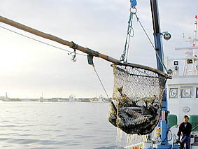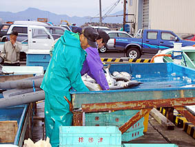 堂々たる雄姿が日の出を従えて 次々と帰ってきた 船倉にはアキアジがいっぱい 早速水揚げ作業が始まる 船倉にも網にも多くは入れない 大切なアキアジを傷つけないためだ 細心の注意を払って選別台に移される 一次選別されたアキアジは塩ビパイプを通って さらに細かな選別をされる 種類ごとに氷で温度管理された水槽(鮮度保持タンク)に保管される ←前へ もどる↑ 次へ→