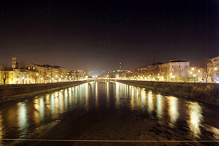 バス移動4時間でヴェローナ到着。昨夜のホテルよりも良い感じだ。夕食はラザニアとサーモン、ワインは1/2ボトルが4ユーロ。21時、夕食後ヴェローナ旧市街までレンタサイクルで出かける。レンタル料は4ユーロだ。街に観光客の姿はあまり見当たらない。ドロミテに源を発するアディージェ川がS字型に流れる。旧市街からピエトラ橋を渡ってローマ劇場に行くべきだったかもしれないが、何せ初めての街。ホテルに帰れるか心配だったためか一番遠い北の端はカット。アレーナとジュリエットの家さえ押さえられればそれで良しと心に決めてペダルを踏む。
