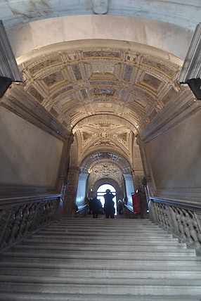 宮殿内で最も大きい部屋は大評議会の間(元老員の間)だ。最盛期にはここで2000人以上の評議員が一堂に会した。ティントレットによる世界最大の油絵「天国」などの絵画で天井や壁が埋め尽くされている。カサノヴァが脱獄したことで有名な宮殿地下の牢獄を経て「ため息の橋」を通った。外が眩しく美しい景色だけに、冷たく狭い牢獄から最期に橋の窓を覗く死刑囚の気持が痛く染み込んできた。