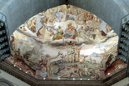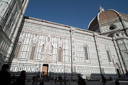 ルネッサンスの発祥の地であり「花の都」と呼ばれるこの街はふとした街角の光景からも芸術の香が漂ってくる。街中が文化遺産そのものだ。その街の中心がドゥオモであることを疑う者はいないだろう。ジョットとその弟子ピサーノによって設計され14世紀後半に完成したジョットの鐘楼も目を引いた。その美しさはフィレンツェを追われたダンテも「神曲」の中で触れている。高さは84メートル、白、ピンク、グリーンの大理石で造られている。塔の下段を飾る六角形のレリーフパネルには、人間の再生の過程が繊細に描かれているが、オリジナルはドゥオモ美術館に収蔵されている。塔の東側にある414段の階段を上れば、美しいドゥオモの姿とフィレンツェの街が一望できるのだが時間がない、次回に再訪した際には是非上ってみたものだ。ドゥオモ内部は圧倒的な外観とは対照的に落ち着いて広さを感じさせなかった。ドゥオモ入場の後は解散場所に移動をした。