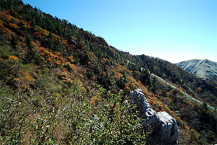 秋の剣山単独幕営初体験-2 尾根道を進めていくうちに眺望も次第に開けていった。南斜面には広葉樹の紅葉が美しく、その南斜面越しにはジロウギュウ(1929m)の容姿が現れた。頂上が近付くにつれてクマザサが目を引く。ようやく1時間の道程で頂上に達することができた。なだらかな平地で、よく整備された木道がクマザサの成育を助けている。快晴の四国山脈を西に一望できる絶景が手に入った。それにしてもザックの重さには閉口してしまった。