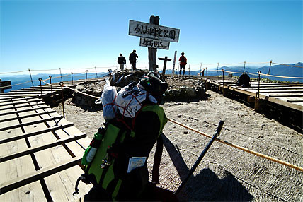 整備された木道で頂上地点(1955m)に達した←前へ もどる↑ 次へ→