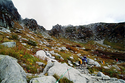 '05初秋の信州駒ケ岳-2/4 雨に降られて傘をささねばならない可能性は無いようだ。すっかり秋の色に衣替えを済ませた千畳敷カールを満喫できた。集合時間が昼食も含めて13時30分と決められた。登ってみたい道が眼前に一筋伸びている。ともかく弁当とカメラを携えながらカールの遊歩道を外れて登山道目指して行けるところまで行ってみる。