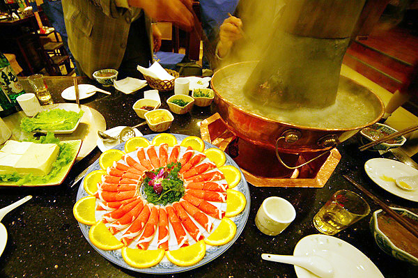天安門広場をあとに、夕食のためレストランに向かう。新彊ウイグル自治区の物産を進行させるための地区に到着。羊肉と牛肉のしゃぶしゃぶ料理をいただく。豪快な炭火の鍋にどんどん肉が入れられ、食べる速度が追い付かない。満腹のうちにホテルに帰った。