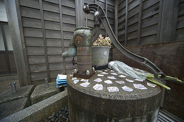 稲忠漆芸会館で漆塗の青山ハープを発見。音や響きにはどんな影響があるのだろうか。弦が切れていて弾けそうもない状態であった。続いて千年以上も前から続いている朝市...と思ったら三が日はお休みだ。閑散とした朝市通りでレトロなポンプを見つけるも、使えない。使えなくても残してほしい風景である。