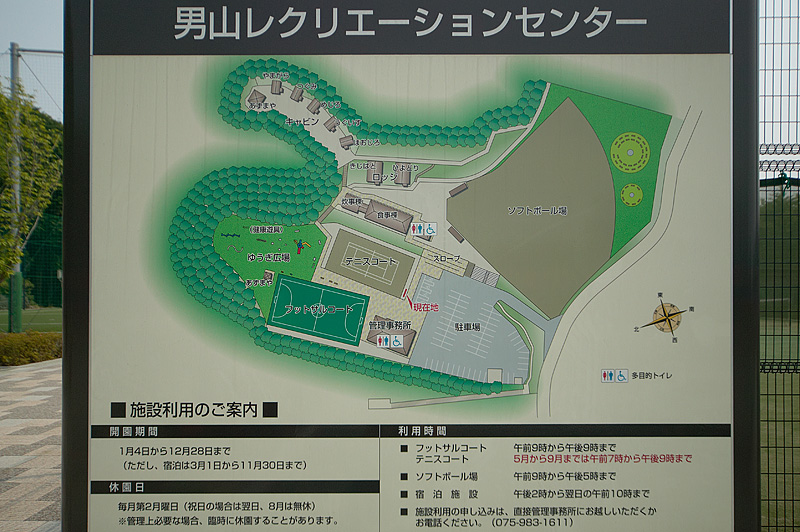 男山レクリエーションセンターは休園日が毎月第2月曜日(祝日の場合は翌日、8月は休園日なし)なので注意が必要。テニスコートやフットサルコート、ソフトボール場などのスポーツが楽しめる施設だ。ロッジ・キャビンなどの宿泊施設は使用日の1週間前まで、食事場・炊事場(日帰り利用)は同3日前までに申込が必要だ。京阪電車の八幡市駅からケーブル利用または橋本駅から徒歩(上り坂がきつい)で20分。