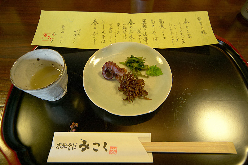 京北散歩-2/3予想外に出くわした雪景色の寒さを柔らかく暖めてくれる京北そば「みこく」で遅い昼食。心尽くしの「春」に、ようやく出会えた喜びでいっぱいだ。どの料理にも春を超えた温もりとこだわりが感じられた。土日のみの営業形態も相まってご主人の思い入れが、ひしひしと伝わってくる。まったりとした田舎時間が心地好く流れていくのだ。