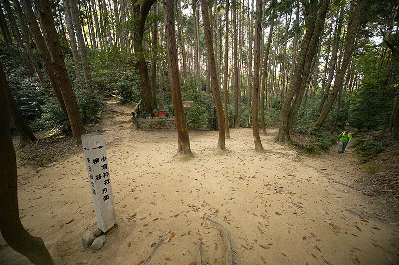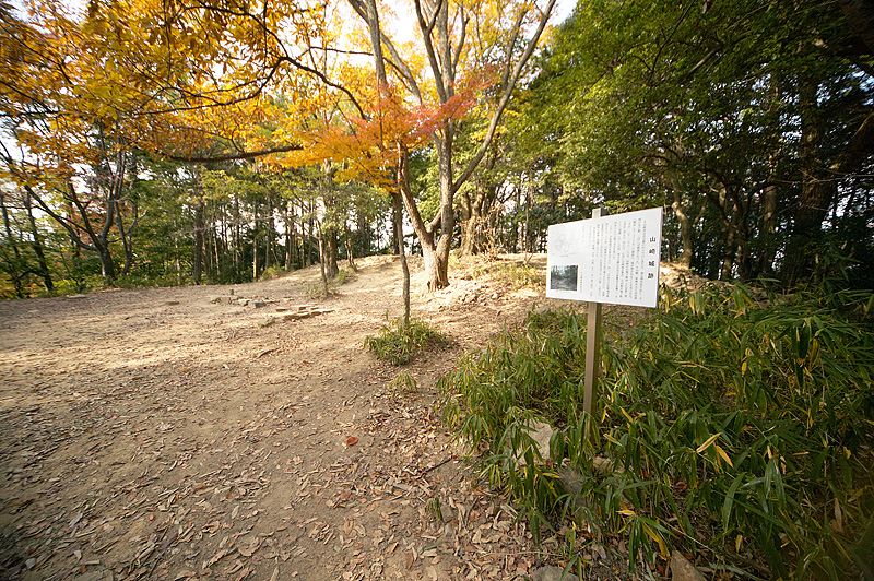 低山だと、なめていたのは間違いだった。きつかった登りも一段落、尾根道からは平坦な下り傾向の道だ。頂上は山崎城跡地でもある。大山崎町のページから「秀吉の道パンフPDF(2.5 MB)」を見ることが出来る。