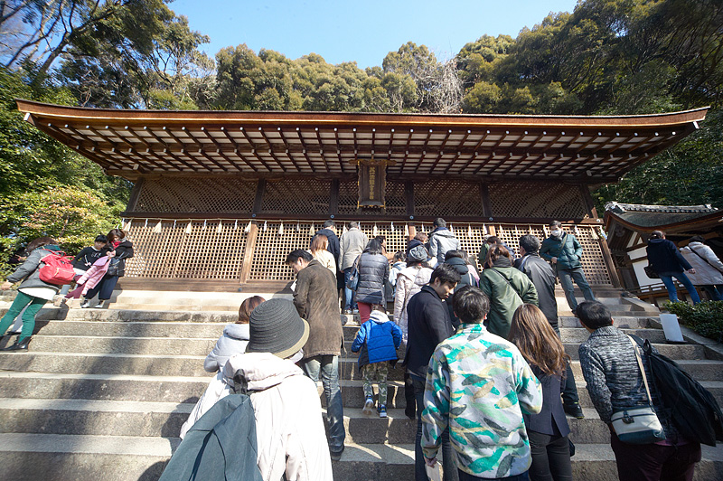 世界遺産の宇治上神社に初詣。菟道稚郎子(うじのわきいらつこ)、応神天皇、仁徳天皇を祀る。本殿は日本最古の神社建築だ。近年行われた建材の「年輪年代測定法」によって、本殿が平等院とほぼ同時期の1060(康平3)年頃に、拝殿は1215(建保3)年頃に建立されたことがわかった。