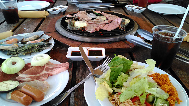 好きな食材を取り、屋外のテーブルで焼く