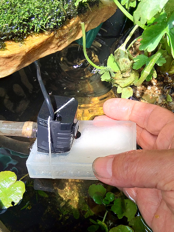 小さな箱に無数の穴を開け、濾過ウールを詰めてポンプを固定する