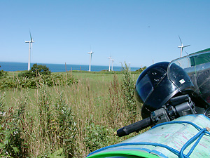 日本海沿いをひたすら南下する。忽然と現れた風車群、思わず丘に登ってみる。