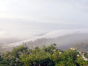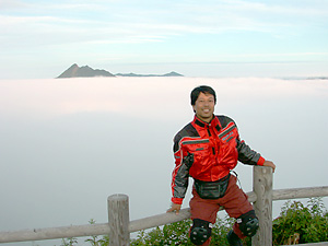 摩周湖に向かう山道は程なく霧に覆われた。上士幌で我々が洗礼を受けた霧に勝る濃いものだった。視界は5m程度と殆ど徐行運転しかできないありさまだ。摩周湖はやはり一面の霧であった。しかし落胆するどころか開いた口が塞がらない。これは何だ、山頂にある湖の外周は見えるのだが湖面は霧で覆われている。