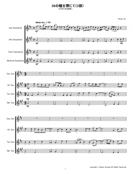 若い音楽家たちを応援する曲「38の瞳を閉じて」のサックス・カルテット版です。